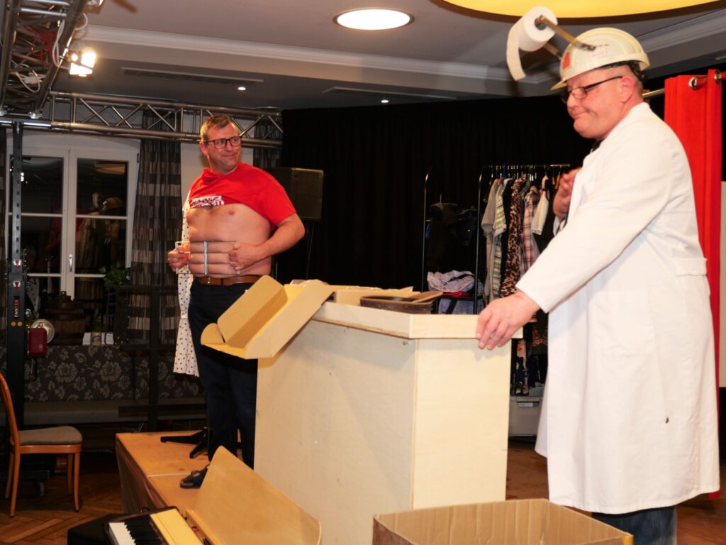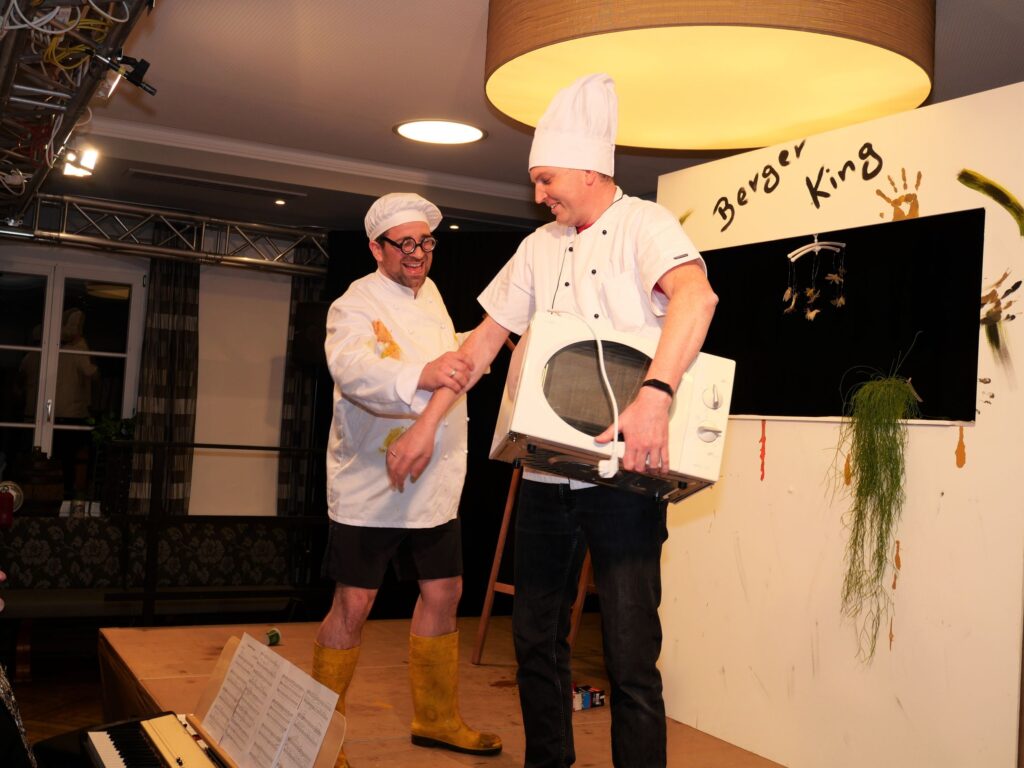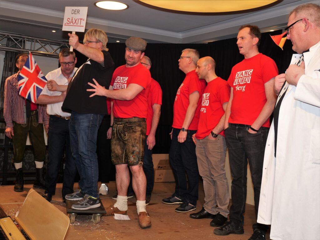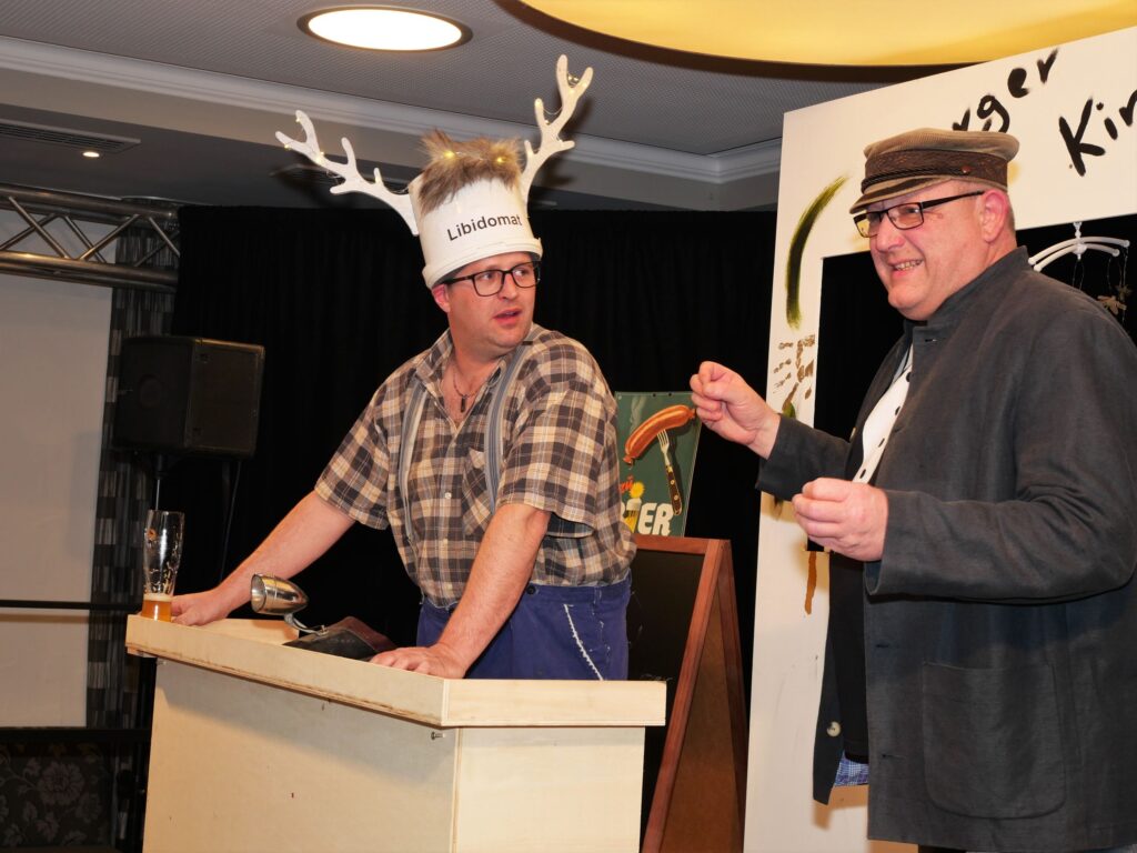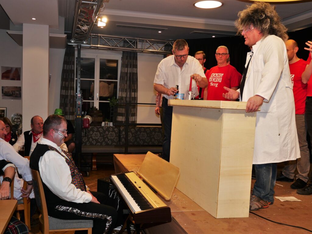 Nachdem der Sängerball letztes Jahr das Rentenalter erreicht hatte, hieß es dieses Jahr frei nach Udo Jürgens: „mit 66 Jahren da fängt der Sängerball erst richtig an„. Am 21. und 23. Februar im Landgasthof und Hotel Rose eröffnete dieses Jahr zum erstenmal die eigens zu diesem Anlass gegründete Böllerkompanie den Sängerball. Die Kompanie hatte noch arg unter Personalmangel zu leiden, so dass nur der Kommandant Franz Rapp mit seinem Schützen Christoph Behmüller zum Salut antrat. Danach sang wie gewohnt der Chor ein paar Lieder, passend zum närrischen Anlass. Norbert Betz und Stefan Geyer ließen es sich auch dieses Jahr nicht nehmen, die Besucher durchs Programm zu führen. Pasend zu den Programmpunkten hatten sie immer eine Erfindung parat, die teilweise schon Nobelpreis verdächtig waren. Unsere Akteure, unterstützt von den Sängerfrauen, hatten sich wieder mächtig ins Zeug gelegt und in Rekordzeit ein witzig- spritziges Programm auf die Beine gestellt. Auch das Musikalische kam nicht zu kurz: unser Dirigent Martin Spranz unterhielt mit der kleinen Besetzung zwischendurch die Ballbesucher. Nach dem Programm konnte man den Abend an der Bar oder auf der Tanzfläche ausklingen lassen.